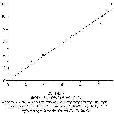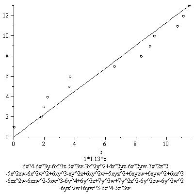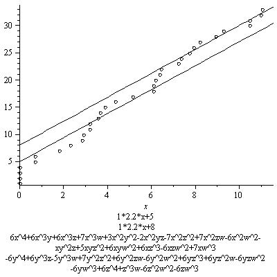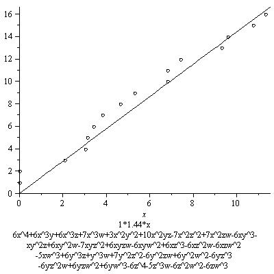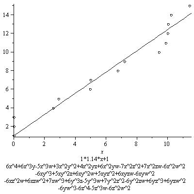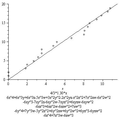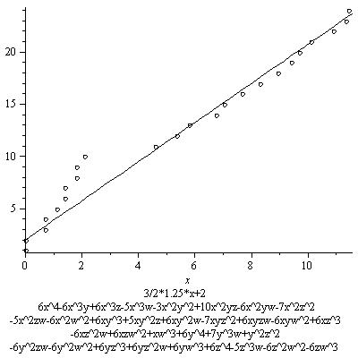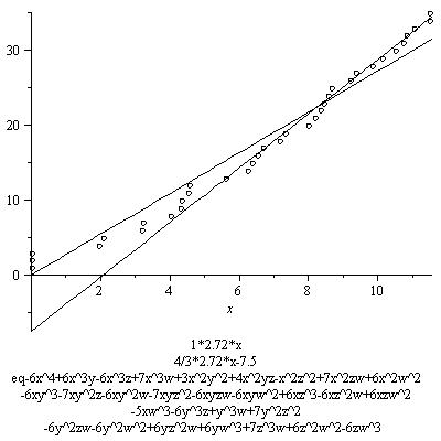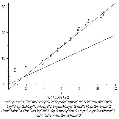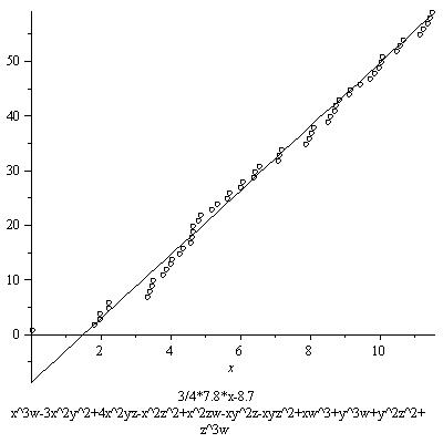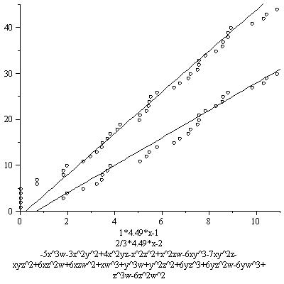The results below are not as striking as the first graph. This is mainly because not as many points are found. This is mostly due to the fact I chose the distribution of -6,0,6 for the coefficients of the monomials to be (2/5, 1/5, 2/5, I believe). This gives many nonzero coefficients, all bigger than the coefficients in the original equation, resulting in a lower contribution from the real place. Of course this is not at all a waste of effort, as if we want to see that the growth of the number of rational points depends on this constant, we better examine examples among which this constant varies, including ones where this constant is small. These examples include some of those. In some other series, however, I will restrict to families with higher real contribution, or only pick out examples with a relatively high real contribution.