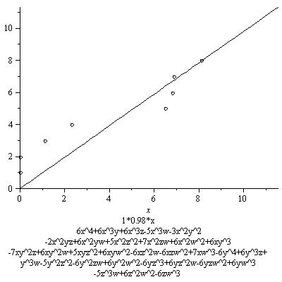 By the way, all rational numbers on this page that the naive constants appear to be off by are among 1 (with multiplicity 15), and 1/2, 2/3, 3/4, 4/3, 3/2, 7/4, 2 (all with multiplicity at most 4), as tallied among all the drawn lines (sometimes two per graph). I am not sure how to interpret the fact that the rational number that the naive constant seems to be off by can be bigger than 1 in this case of geometric picard number 1. Perhaps this means in those cases we see many more rational points for low height than we would expect from the correct asymptotics, making the growth seem faster than it really is. Indeed, from these graphs with few points one can not deduce much. However, there are a lot of graphs, and in each the growth we see is very close (up to a factor of at most 2) with the expectation coming from the naive constant.