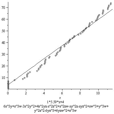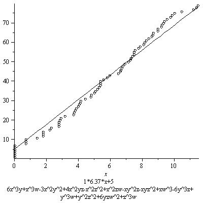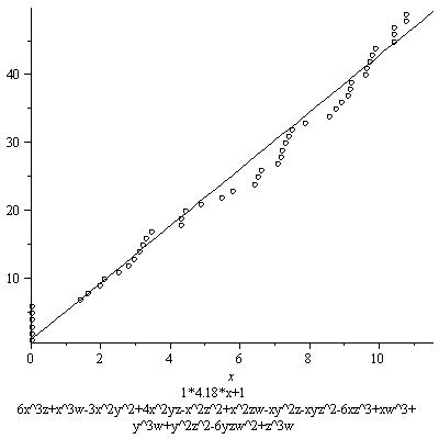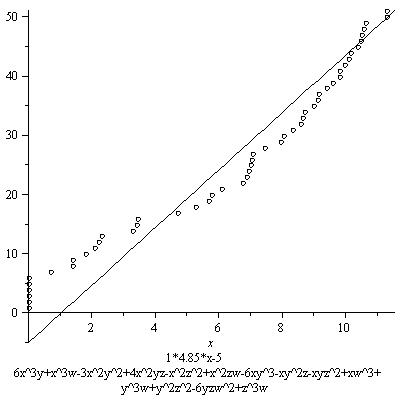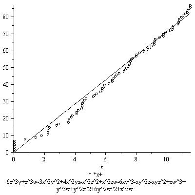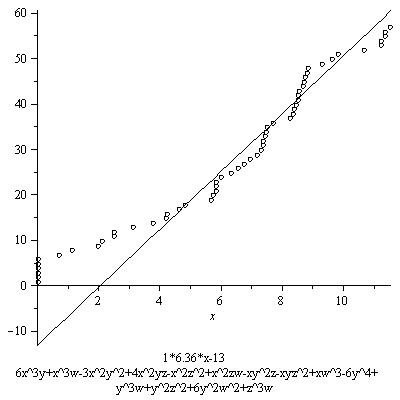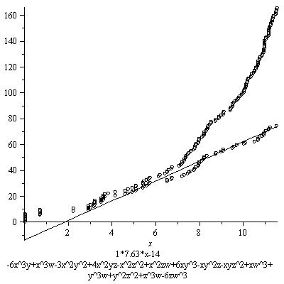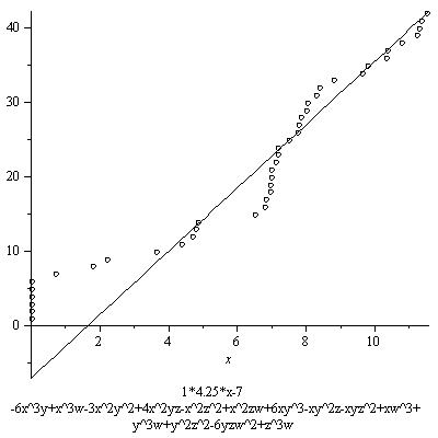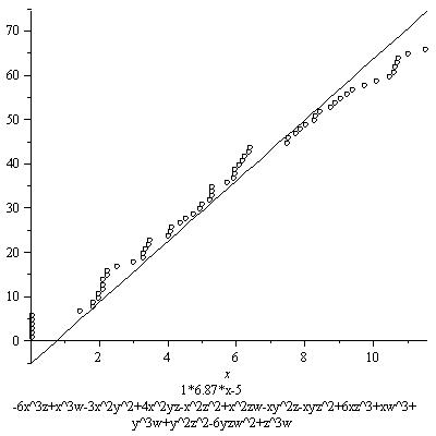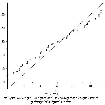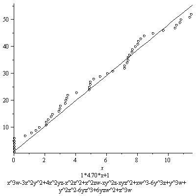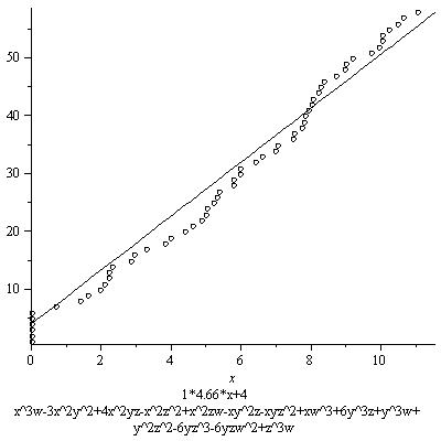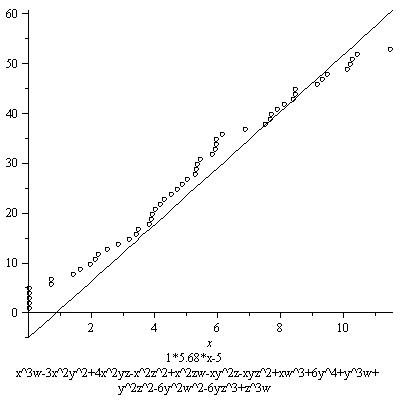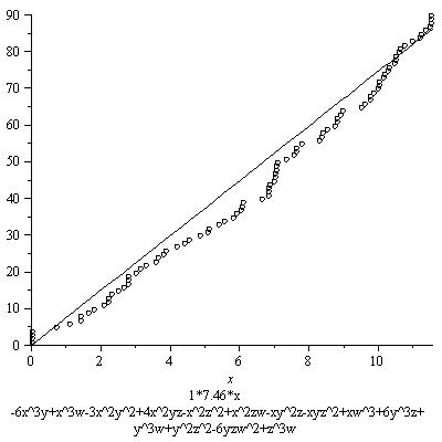 On the examples for the second series we had lots of points, but the number of points of low height appeared to be growing a lot slower than expected. Here we check if that was because we often threw out the hyperplane sections x=0 and w=0, as they often had genus 0 or 1. In this series we chose examples where that doesn't happen. As said before, all surfaces are congruent modulo 6 to the same surface, let's say that one is given by F=0. For all triples m1, m2, m3 of monomials of degree 4 and triples a1,a2,a3 in {-1,0,1}, I computed the genus of the hyperplane sections given by w=0 and x=0 of the surface given by F = a1*m1 + a2*m2 + a3*m3. For all cases for which both genera are at least 2, I computed the contribution of the real place to the naive constant that is the product of local densities. Below are all 14 examples for which that contribution exceeded 6.