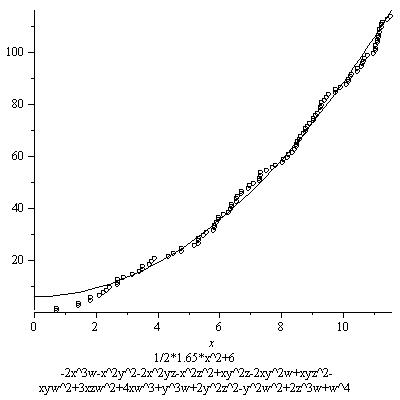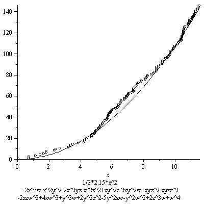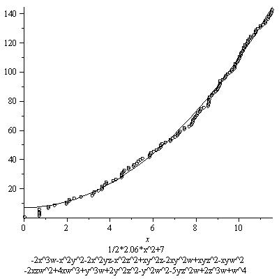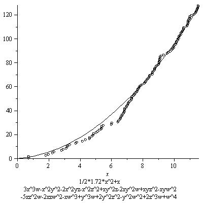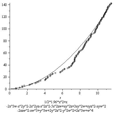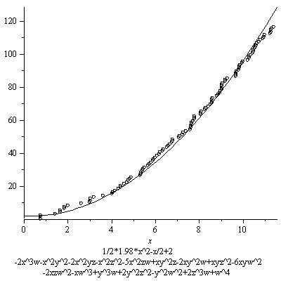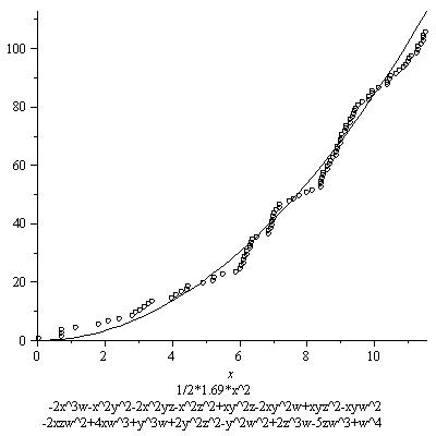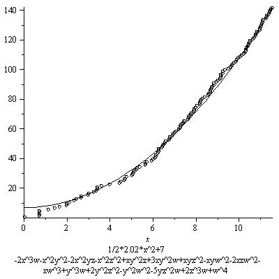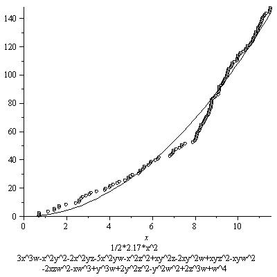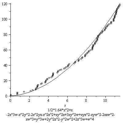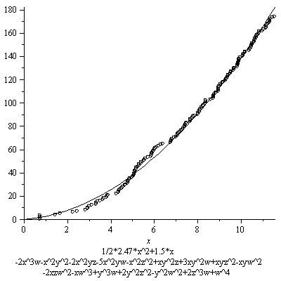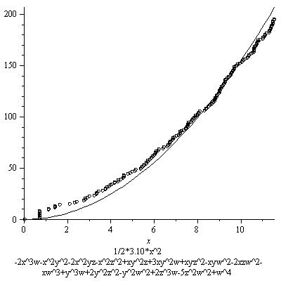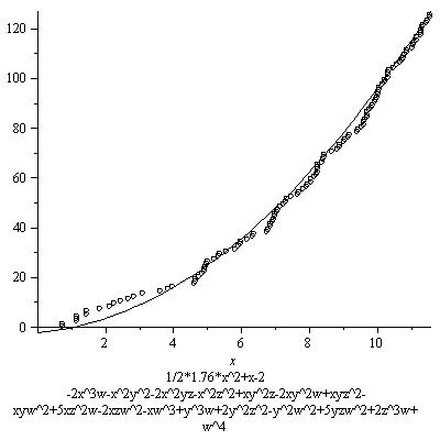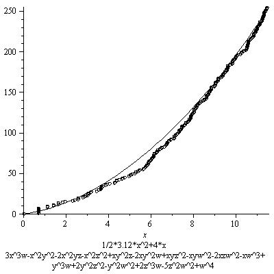 The parabolas all of the form y = 1/2*c*x^2+d*x+e, where c is the product of local contributions, e.g. (1-1/p)^2 * #X(F_p) /p^2 for nonarchimedean primes of good reduction. Although the surfaces are chosen to have a high contribution to c from the real place, the contribution at 2 and 3 is often quite a bit smaller than 1. The constants d and e are picked just by eyeballing to fit the data. Not much time or anything fancy was used there.