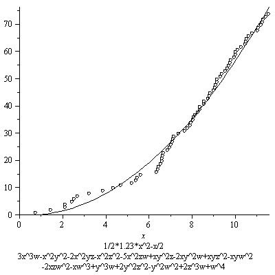 For this series I took 20 examples of picard number 2. They all originate from the same example. I take F1:=-2*x^3-2*x*y^2-x*y*w-2*x*z*w-x*w^2+y^3-y^2*w+2*z^3+w^3, F2:=x*y+x*z+y*z, and F3:=x*y+x*z-2*y*z. I went rhrough all combinations f = w*(F1+5M1)-(F2+5*M2)*(F3+5*M3) with M_i appropriate monomials, as well as f = w*(F1+5M1+5*M2)-(F2)*(F3) with M1 =/= M2 and selected all where the contribution from the real place exceeded 9. Then given the fact that many of these were of the first form with M2=0 and M3=xw, I also went through those of the form w*(F1+5M1+5*M2)-(F2)*(F3+5*x*w) exceeding 9. There are 61 total. I computed the points of height at most 100,000 for 20 of these, shown below.